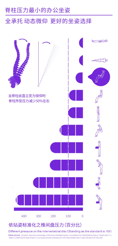例如,在傳統人體工學(xué)椅中,我們會(huì )指出正確的坐姿是3個(gè)90°的“正坐坐姿”。但現實(shí)情況是,“正坐坐姿”要求人們有一個(gè)相對健壯的核心肌群,尤其是腹??;而長(cháng)期久坐的人,基本上都沒(méi)有強健腹肌,也就意味著(zhù)無(wú)法主動(dòng)維持“正坐坐姿”,最后“正坐”都會(huì )演變?yōu)樗?/span>